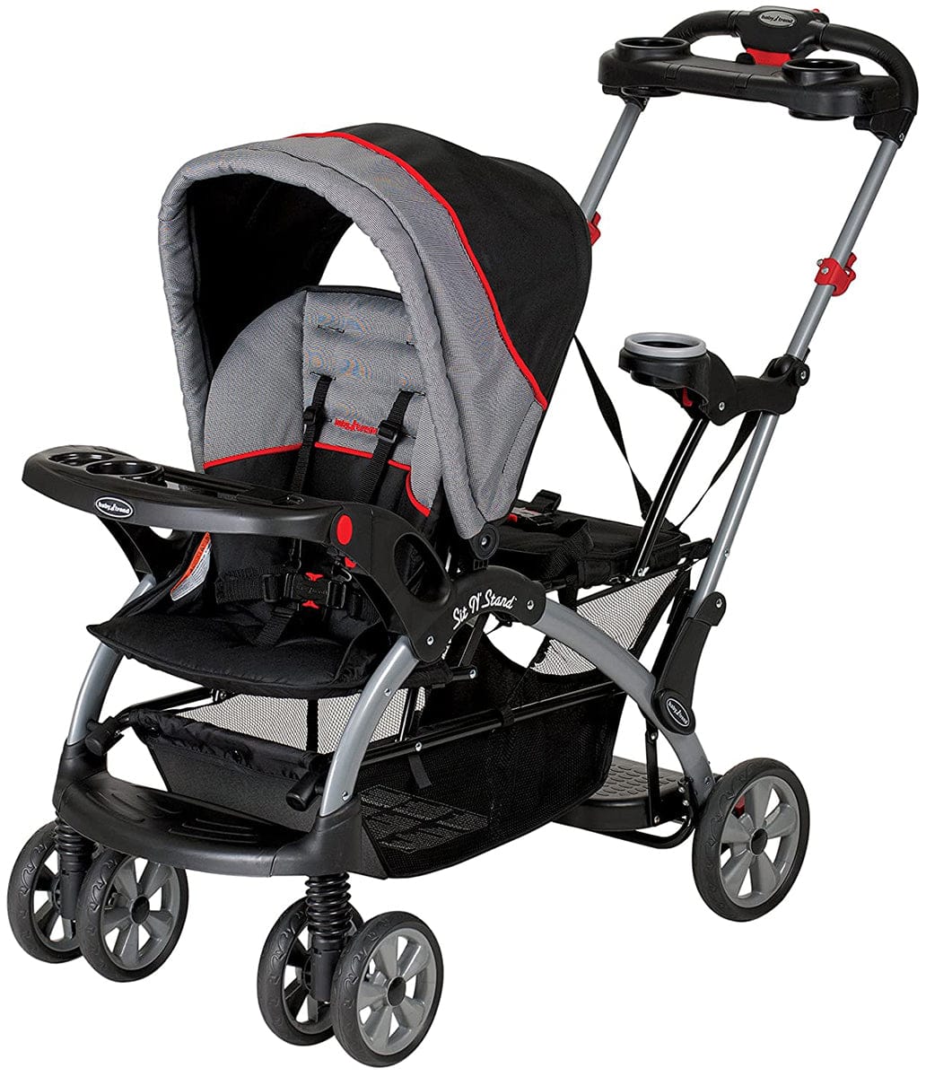 - Children can sit in the front and rear seats of this stroller or stand on the rear platform