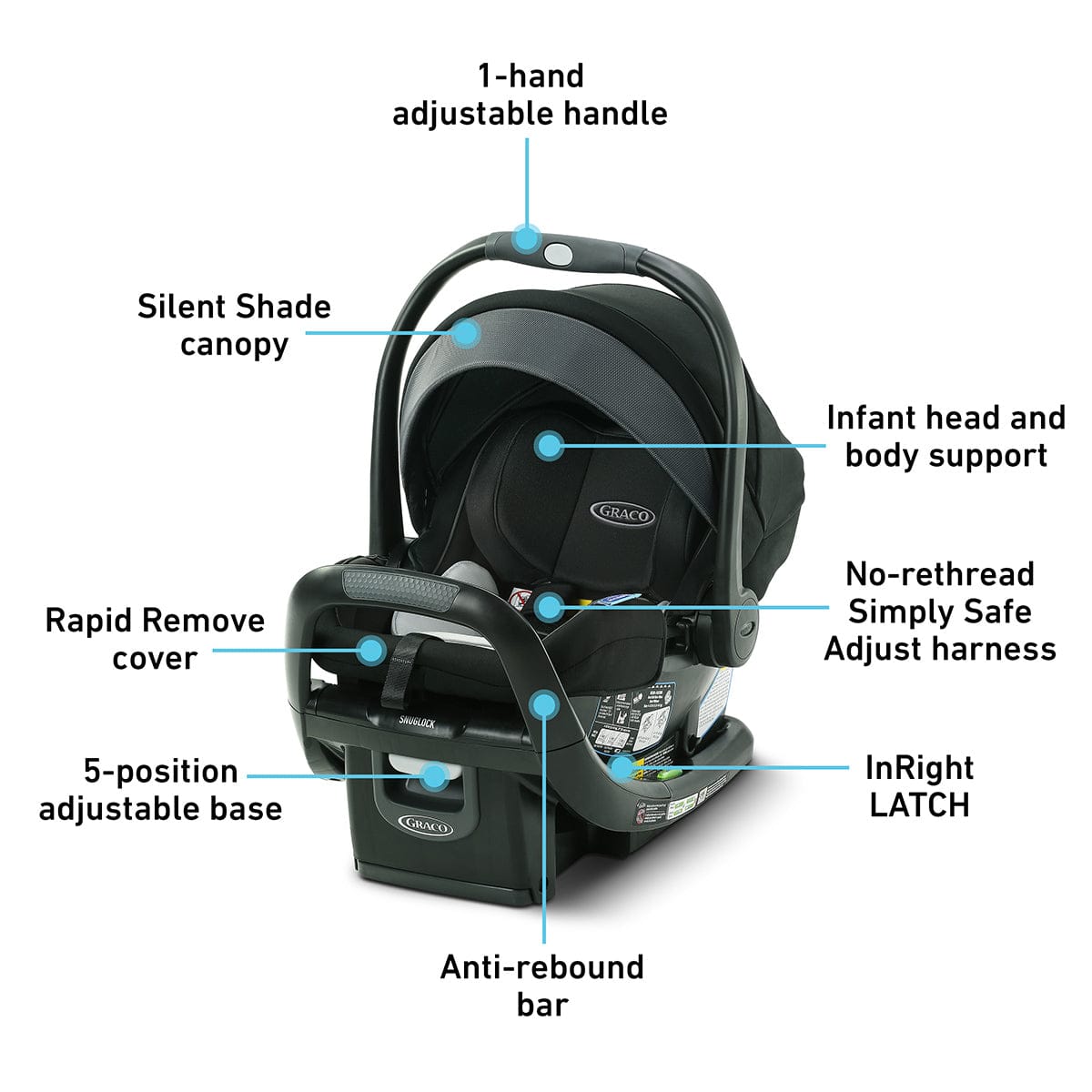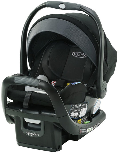 Graco® SnugRide® SnugFit™ 35 DLX Infant Car Seat features an Anti-Rebound Bar, which provides an additional layer of rear-facing safety by limiting rotation of the seat and your child in the event of an impact. SnugRide® performance helps to protect rear-facing infants from 4-35 lb and up to 32". From the makers of SnugRide®, the SnugFit™ line of infant car seats pairs safety technologies with easy installation and comfort features for your little one. SnugLock® technology installs in less than one minute using vehicle seat belt or LATCH. The headrest and harness can be adjusted together while your child is in the seat with the front-adjust No-Rethread Simply Safe Adjust™ Harness System. Graco’s exclusive InRight™ LATCH attachment provides an easy, one-second attachment with an audible click to help ensure secure installation. The 5-position adjustable base and an easy-to-read bubble level indicator help with proper installation. Infant head and body supports and harness covers offer a comfortable fit for your little one. The Silent Shade™ canopy adjusts quietly without disturbing baby, and 1-hand adjustable handle makes getting baby in and out easy. Plus, the Rapid Remove seat pad quickly and easily removes for cleaning. Create your own travel system or use in multiple cars: the SnugRide® SnugFit™ 35 DLX attaches with a one-step secure connection to Graco® strollers and infant car seat bases. The car seat is Graco® ProtectPlus Engineered™ to help protect in frontal, side, rear, and rollover crashes.