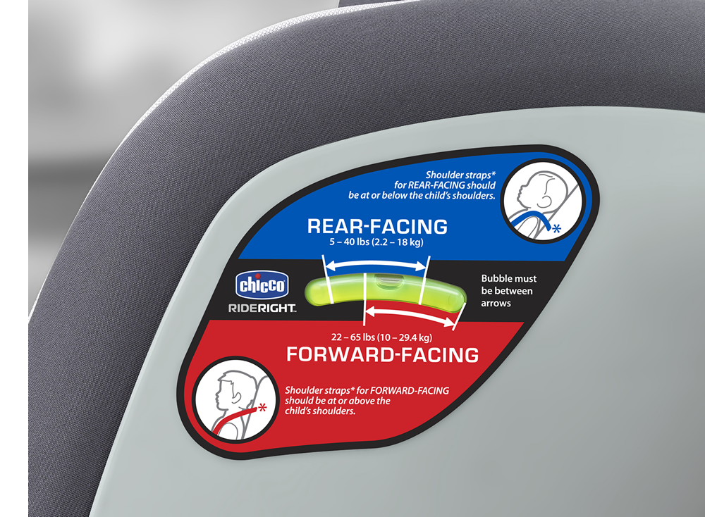- Two RideRight? bubble levels indicate correct seat angle in both rear-facing and forward-facing modes