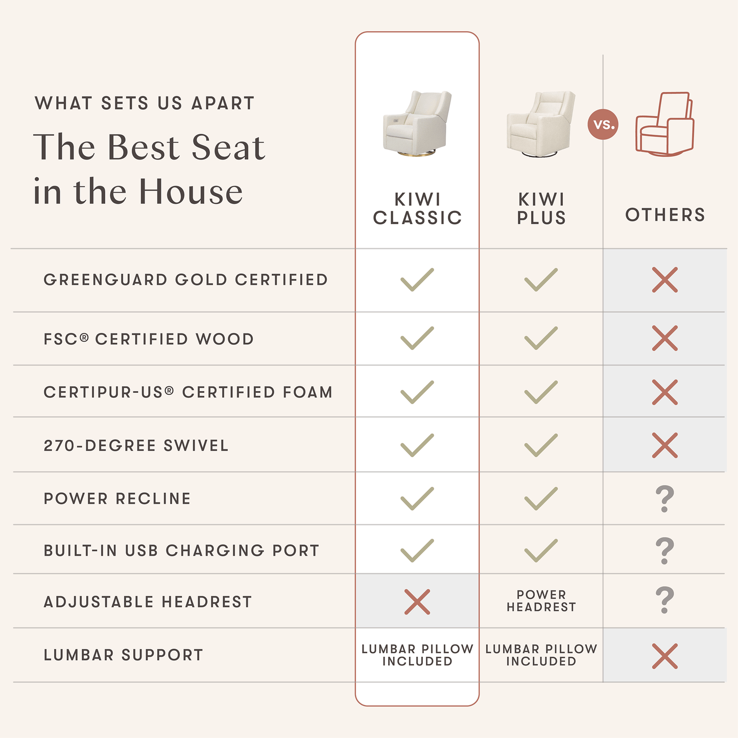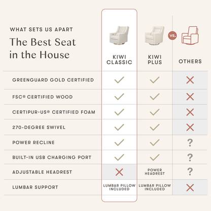 Experience the perfect blend of comfort and convenience with the Kiwi Glider recliner. The smooth and quiet reclining mechanism effortlessly lowers the headrest and raises the footrest at the touch of a button, providing you with ultimate relaxation. Keep your phone fully charged with the included USB A/C charging port, while the removable lumbar pillow offers additional back support.