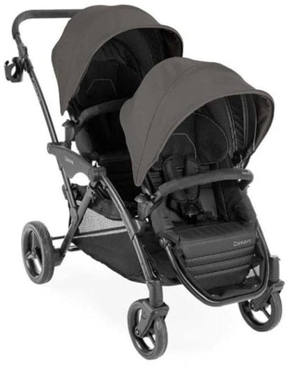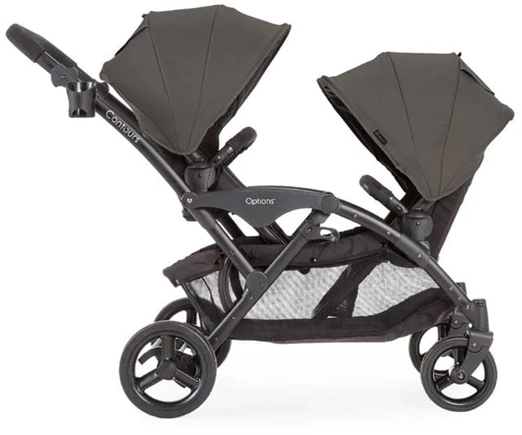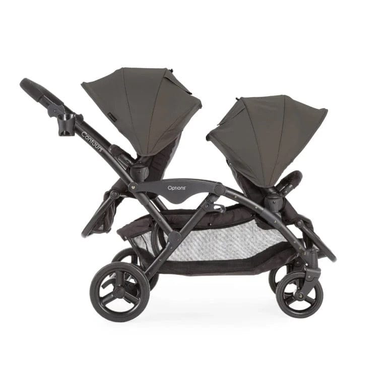 Our best-selling double stroller is now even better! The Contours® Options™ V2 Tandem Stroller is ideal for parents with two in tow. The Contours® Options® V2 has all of the versatile seating positions parents love, dynamic front wheel suspension for the best ride over any surface, stadium-style seating with independent seat reclines and plenty of leg room between the seat. Plus, the V2 now has even more premium features like an improved easy-lift seat design to make it even easier to reverse the seats while on the go, quilted seat tailoring, mesh in the footrest area for more airflow and an updated design. Enjoy the convenience of pull-out sun visors on both canopies, an extra-large storage basket, parent cupholder and reversible seating configurations with best-in-class legroom between the seats to keep everyone happy. Compatible with either one or two infant car seats (car seats and adapters sold separately) this tandem stroller makes it easy to transport your little travelers. On-the-go with two in two is now even easier!