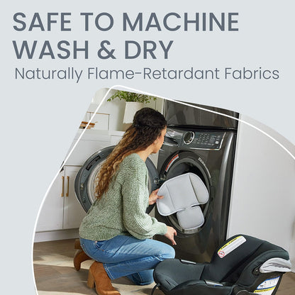 This baby car seat features naturally flame-retardant fabrics that are safe to wash and dry, along with an extra layer of cushioning helps prevent skin irritation and keep your child comfortable.