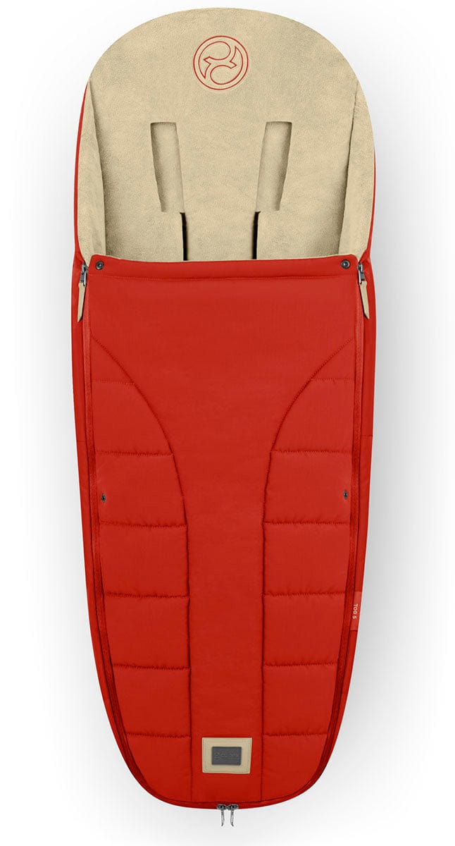 The elegant CYBEX Platinum footmuff offers a soft fleece lining that keeps your child warm. The leatherette fabric and metal accent logo fits perfectly with the stylish design of our Platinum strollers and protects against cold, wind and rain.