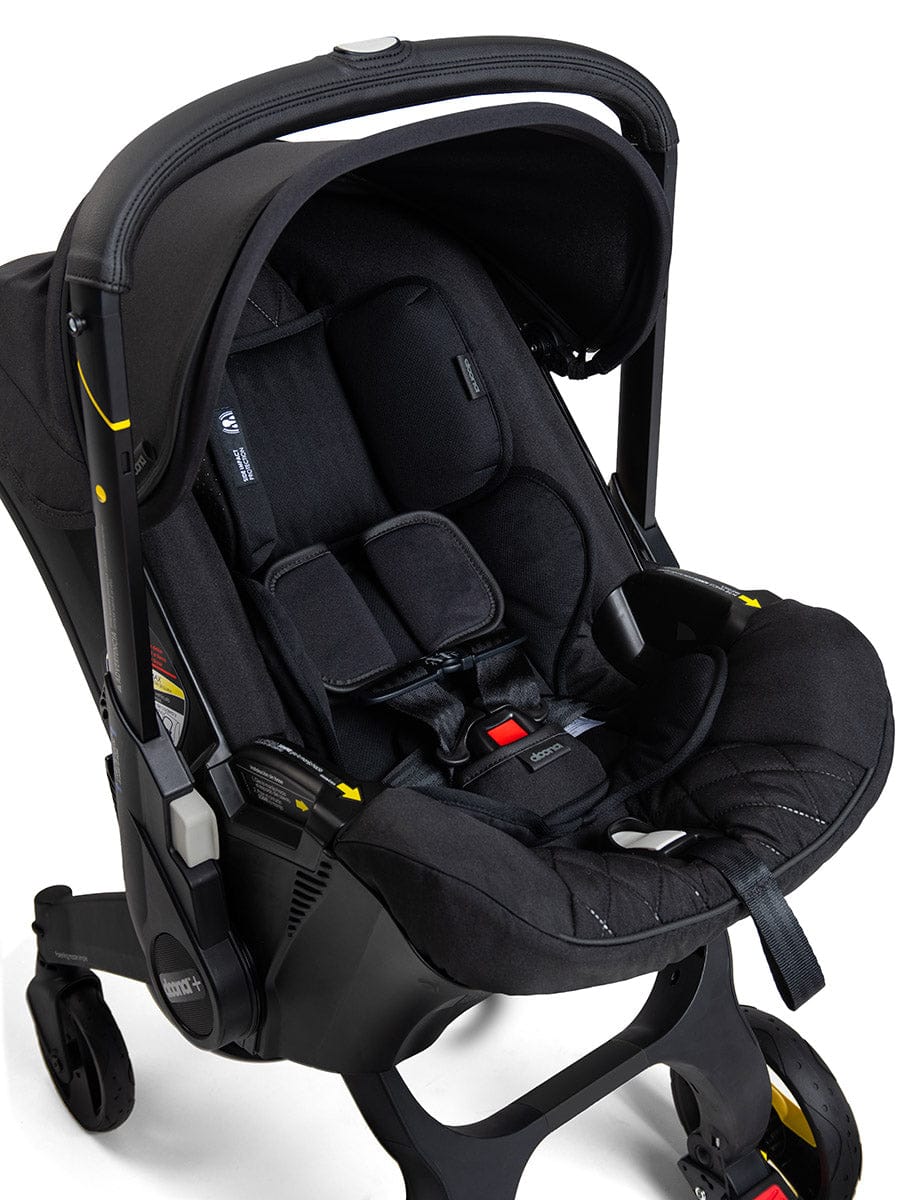 The Doona Midnight edition features a diamond shape seat cover, black anodized aluminum, and faux-leather touches throughout. This edition includes an exclusive complimentary Doona Midnight Essentials Bag and a luxurious black faux-leather Handlebar Cover.