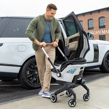 The Shyft DualRide Infant Car Seat and Stroller Combo is a single piece of baby gear that Shyfts from infant car seat to stroller in one step, streamlining life on the go. Moving from car to sidewalk? Simply lift the carrier off the base, release the wheels and you’re rolling in no time. From backseat to street in a heartbeat! Maneuvering stairs? Retract the wheels, carry up/down steps, pop the wheels back down and stroll on. No struggling with multiple pieces of gear. No disturbing your little one. This car seat stroller combo makes every trip easier.