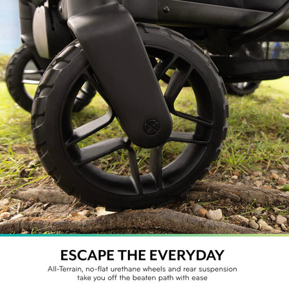 • ESCAPE THE EVERYDAY: Rugged-meets-refined stroller wagon engineered for performance features all-terrain, no-flat urethane wheels and rear suspension to take you off the beaten path; accommodates up to two children ages 6 months to 5 years