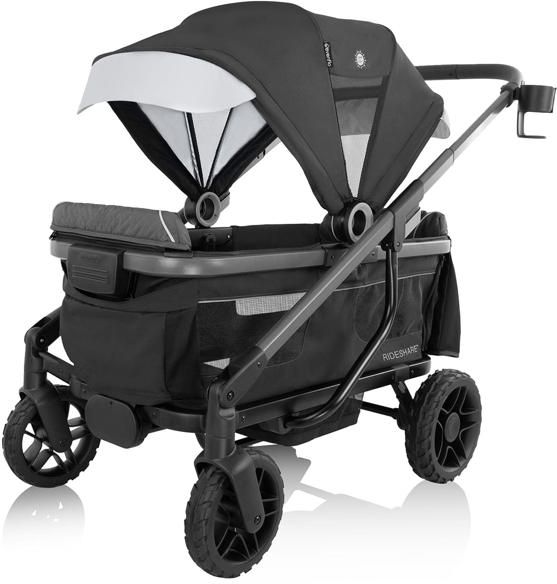 Range far from the everyday with the rugged-meets-refined Evenflo® Shyft™ Rideshare™ All-Terrain Performance Stroller Wagon. Every detail has been engineered for performance, starting with the all-terrain, no-flat urethane wheels and rear suspension that allow you to master challenging terrain. Forge your own path with up to two children ages 6 months to 5 years — each seat accommodates a child up to 55 lb (110 lb total). Sides release and drop down with ease so kids can climb in independently or you can load up to 110 lb of gear*. Our unique cargo mode* will come in handy for hauling gear to the beach long after little adventurers have outgrown this ride. We added an innovative, built-in infant car seat attachment to accept your Evenflo LiteMax™ Infant Car Seat (sold separately) with no tools or adapters needed, because adventures are better when it’s this easy to bring your little one. For seated riders, the Rideshare includes an expandable UPF 50+ canopy to help protect against the sun’s harmful rays, with a visor that can flip up to accommodate a child up to 45 in. tall — all while providing full 360° views! Spacious seating and a large footwell offer plenty of room to grow. The 3-point harness adds security as you’re rolling. The 3-position telescoping handle lets you adapt to the landscape. Push your Rideshare as a stroller or pull your Rideshare as a wagon to make going uphill easier — whatever your quest calls for! When it’s time for a pause, the flip-flop friendly brake holds your stroller wagon in place. We made sure escaping the everyday comes with all the comforts. Rideshare offers 2 parent cup holders that face either in or out from the handle as your path calls for, a BPA-free child snack tray with 2 cup holders, plus a large storage basket to hold what you need for your trip. For convenient storage, Rideshare can fold flat and self-stand upright and out of the way. For an even more compact fold, the wheels are easily removed with the press of the release buttons. Complementing the performance details, premium fabrics and finishes ensure that you’ll adventure in style. Shyft Rideshare. Escape the everyday. (*Cargo mode is not to be used for transporting children.)