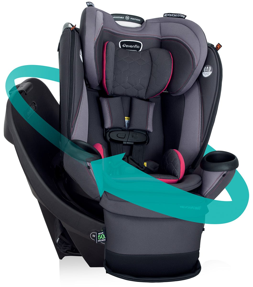 The revolution just got extended! The Evenflo® Revolve360™ Extend™ All-in-One Rotational Car Seat with Quick Clean Cover offers the extended security of rear-facing all the way up to 50 lb. Child safety experts say the longer your child remains rear-facing, the better, and the Revolve360 Extend is here to help with peace of mind all the way around. A spin-off of America’s bestselling rotating car seat, the Extend makes it easy to get your child in and out of the car with just one hand. Convenience by design doesn’t end there. This innovative car seat comes with a zip-on, ergonomic leg rest to add comfort for growing legs. Install the seat just once for rear and forward — no need to remove in order to make the switch.