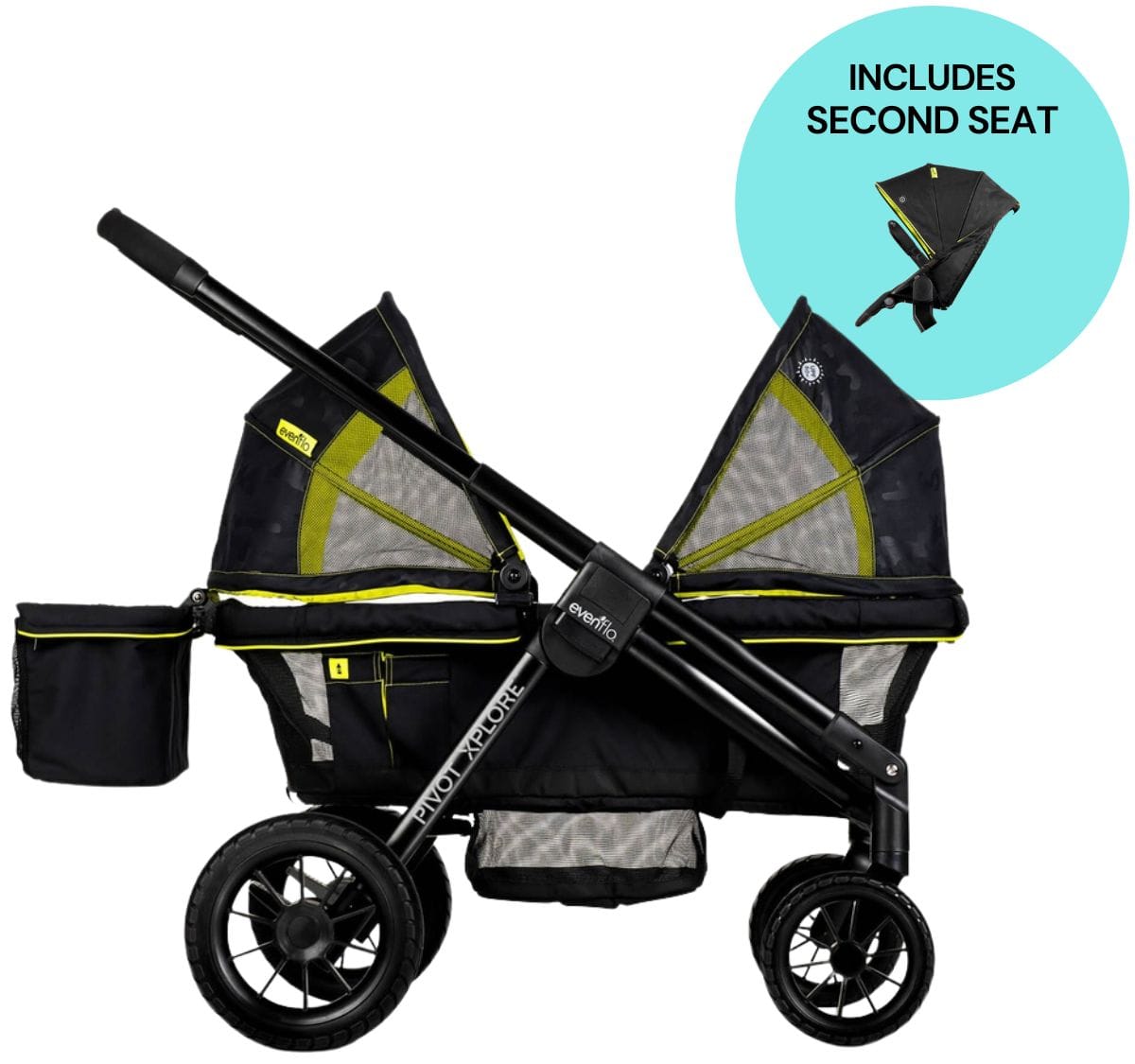 • VERSATILE MODULAR SEAT: With two kids in tow, the versatile second seat fits perfectly on the Evenflo® Pivot Xplore™ All-Terrain Stroller Wagon. It accommodates a child up to 55 lb at a secure, elevated level closer to you while still leaving plenty of room for a second rider below. Push or pull the Pivot Xplore with a flip of the handle without removing the second seat.