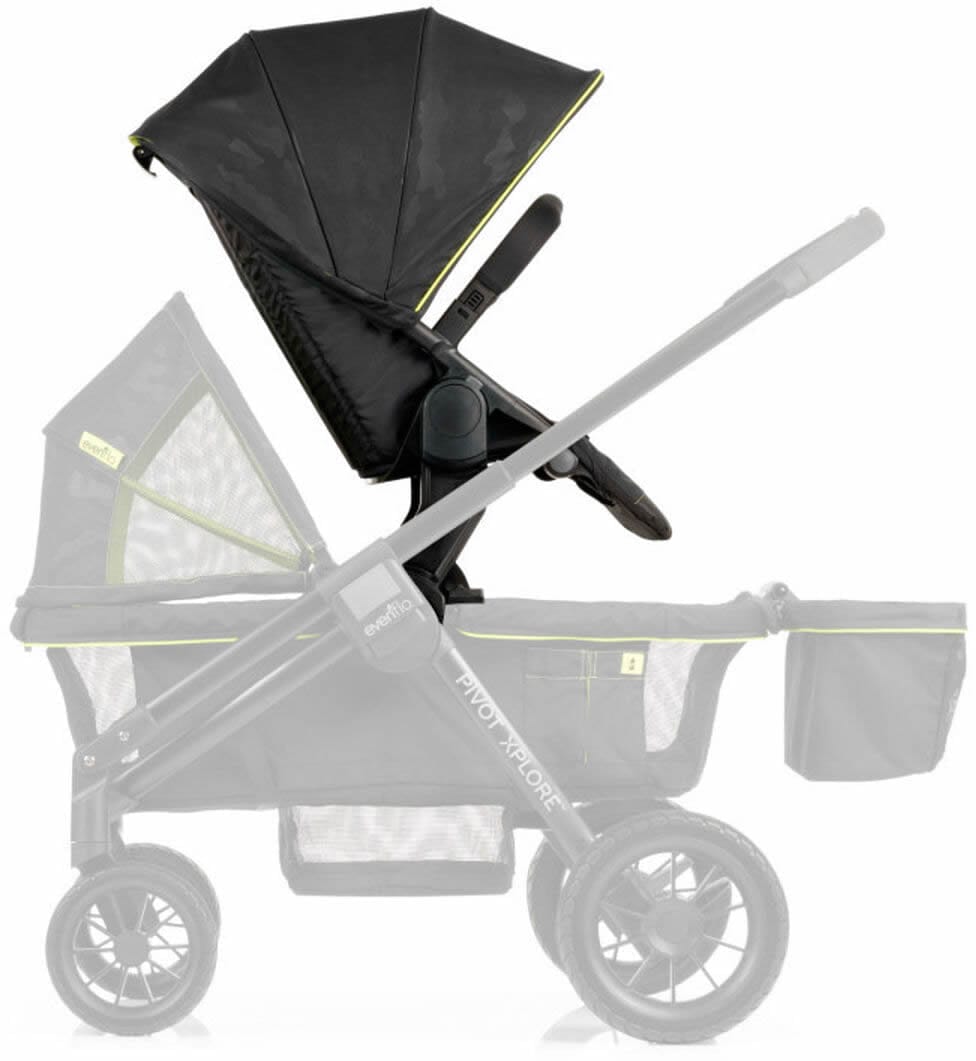 - VERSATILE MODULAR SEAT: With two kids in tow, the versatile second seat fits perfectly on the Evenflo® Pivot Xplore™ All-Terrain Stroller Wagon. It accommodates a child up to 55 lb at a secure, elevated level closer to you while still leaving plenty of room for a second rider below. Push or pull the Pivot Xplore with a flip of the handle without removing the second seat.