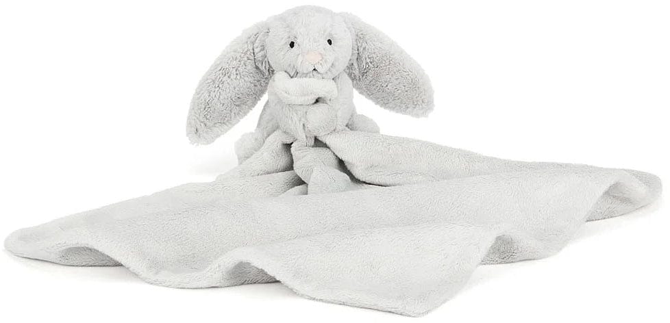 A perfect gift for newborns, the Bashful Silver Bunny Soother is our most loved Bashful Bunny in a soft fur, with long lopped ears, a pink suedette nose and stitched eye detail holding a square shaped soother, un-stuffed and irresistibly soft to touch. Made from recycled fibres and neatly rolled up and presented with a Baby Jellycat grosgrain ribbon.