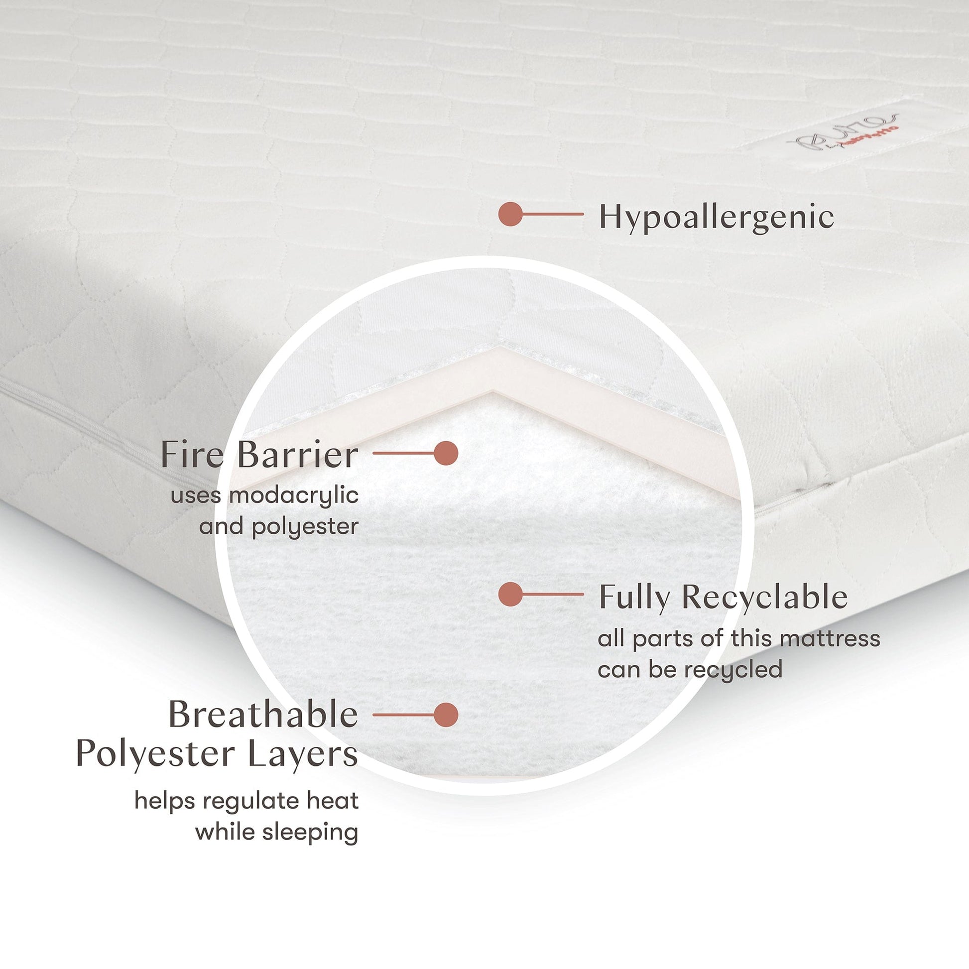 • SAFE FOR BABE: Passes all government flammability requirements and the 100% recyclable polyester core is free of chemical flame retardants, allergens, polyurethane, soy foam, vinyl (PVC), PFC's, synthetic latex, and dyes.