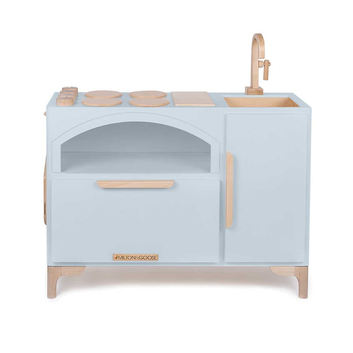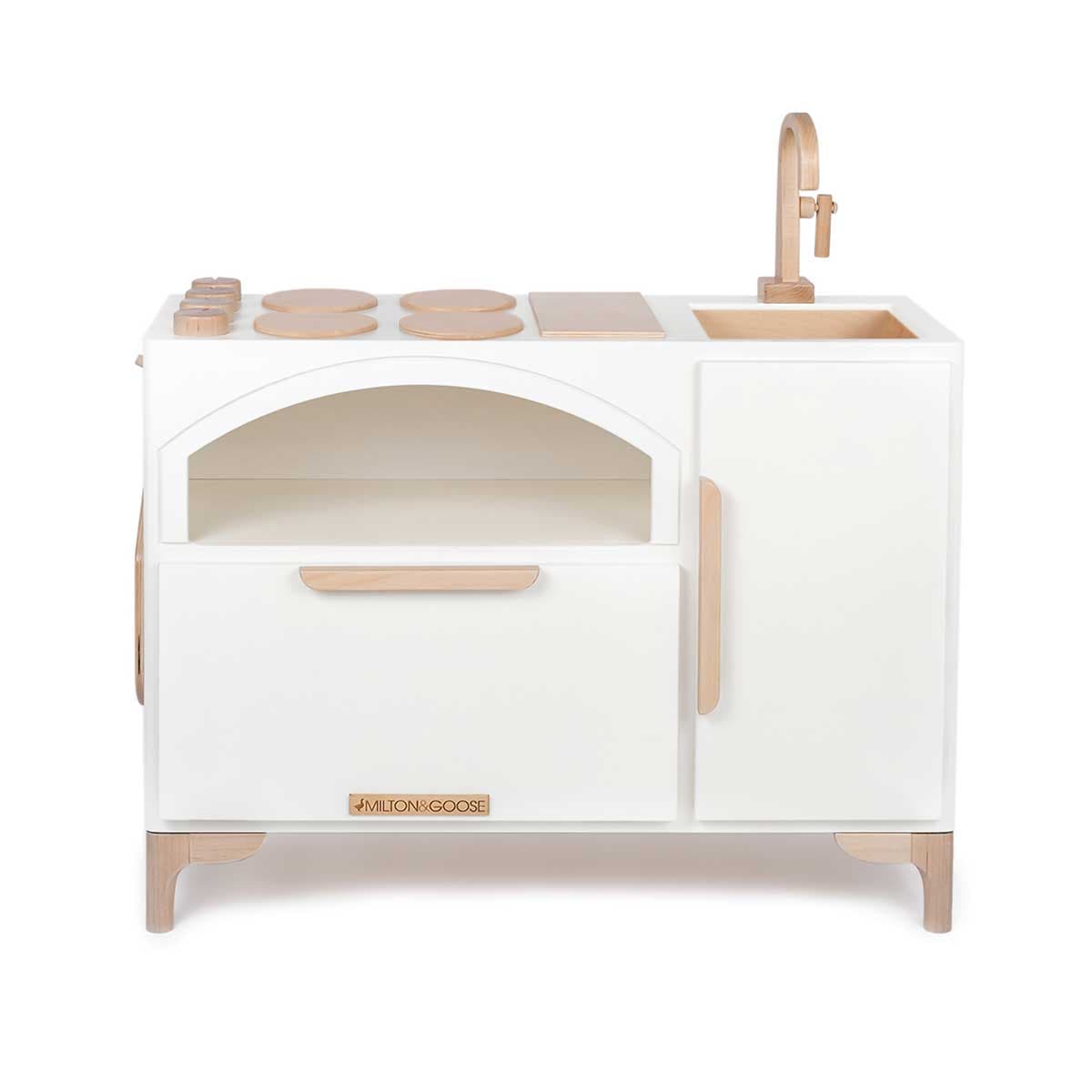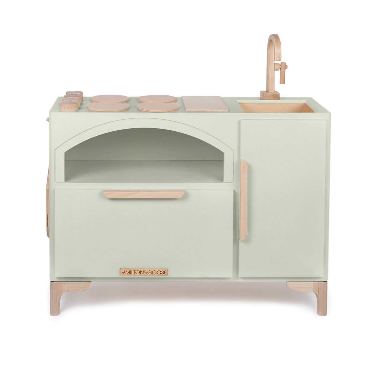 Crafted from sustainable wood and finished with non-toxic paints and stains, the Milton & Goose Luca Play Kitchen prioritizes safety and durability. The sturdy construction ensures long-lasting play and allows multiple children to enjoy cooking adventures together.