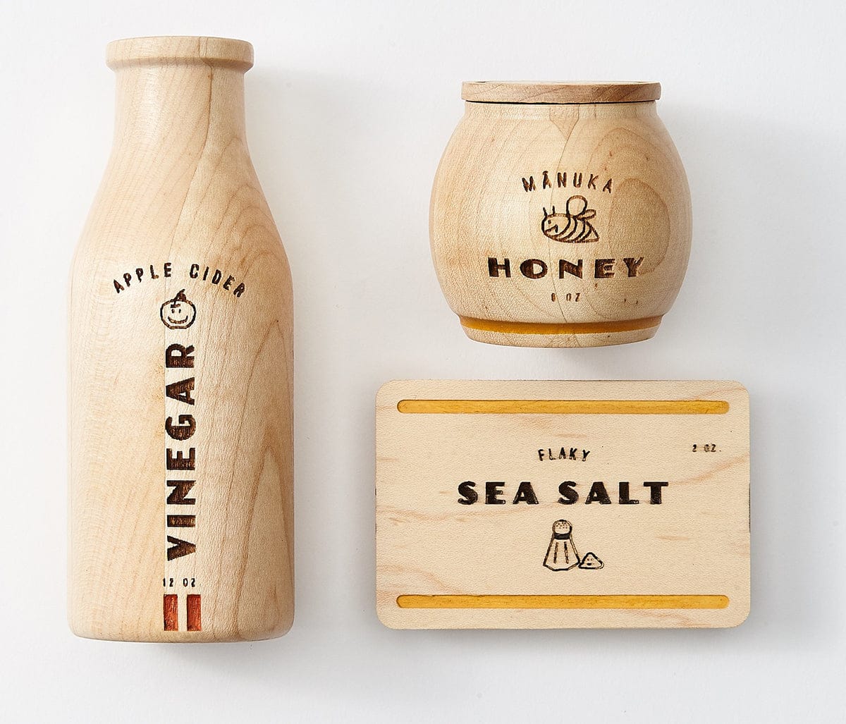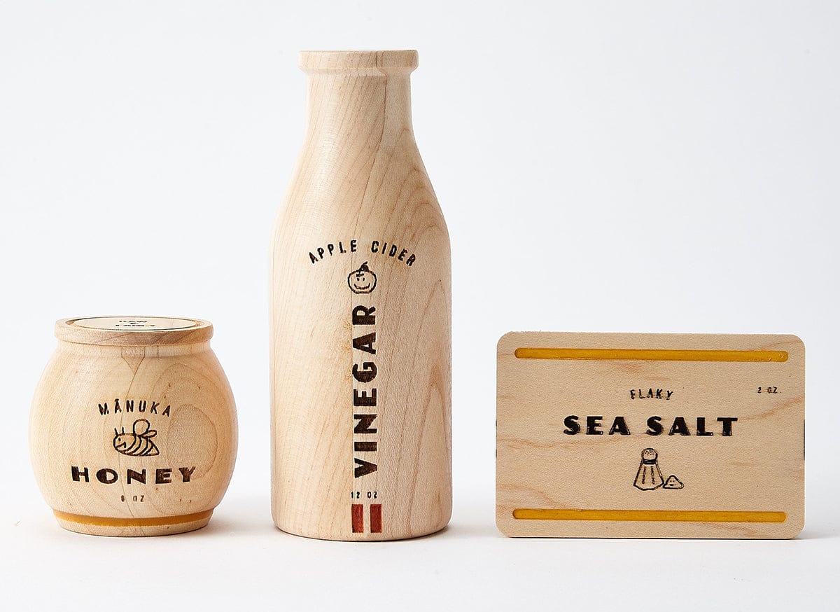 A modern take on the pantry essentials every little chef should have in their arsenal. Jar and box open for expanded play. Each set includes Apple Cider Vinegar, Manuka Honey, and Flaky Sea Salt and comes in a beautiful cotton drawstring bag.