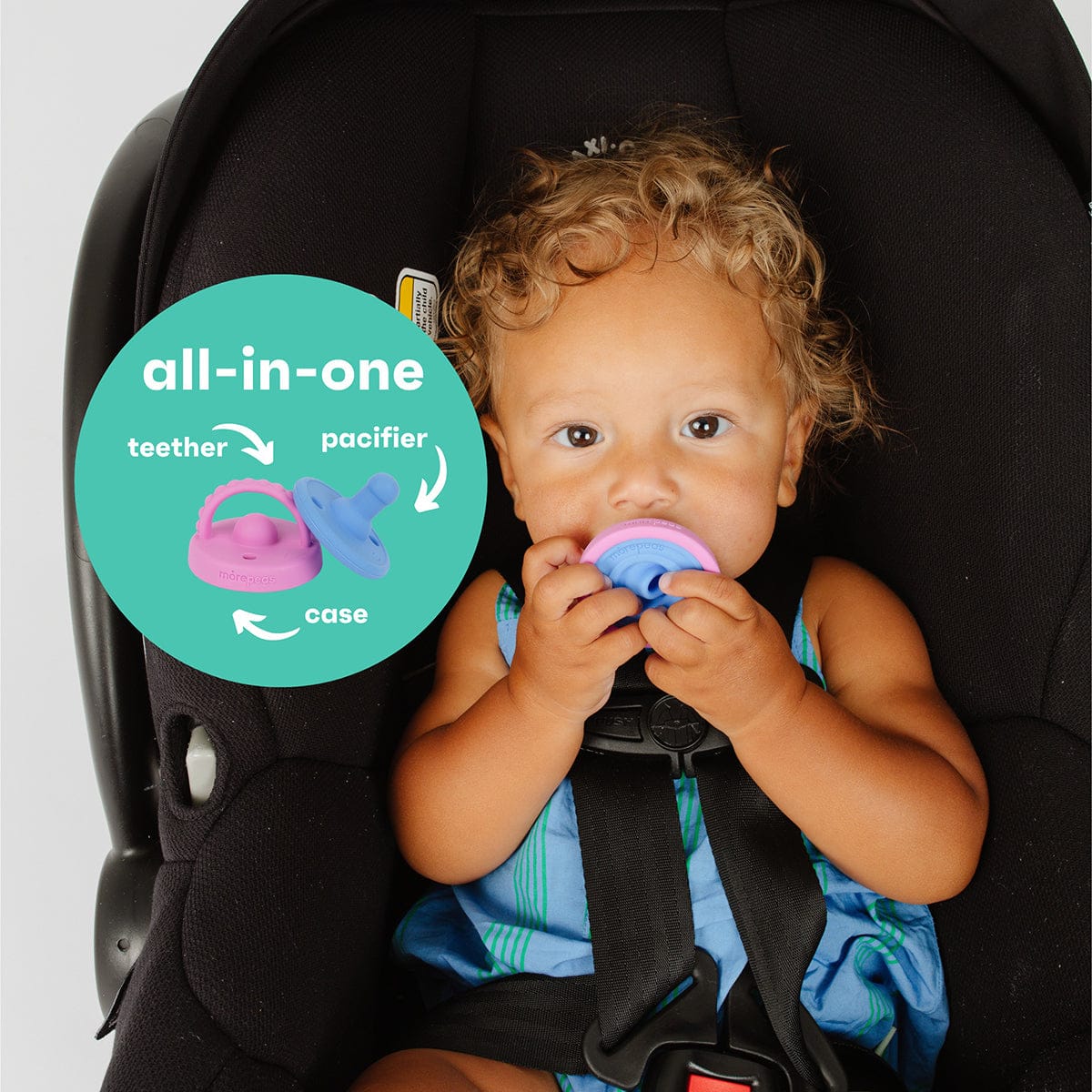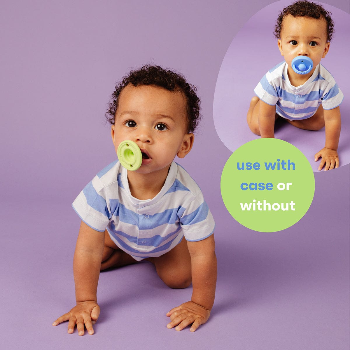 This all-in-one pacifier + teether + case has never been seen before! You can flip it and store it! The bright colors will have your little one reaching for it just as much as you. It's perfect for on-the-go and when not in use, flip the pacifier into the case to protect it from all the yucky stuff. The ring also doubles as a teether to soothe your little one. It's made from premium, 100% toxin free silicone. The perfect accessory for kids who have somewhere to be - yes peas!