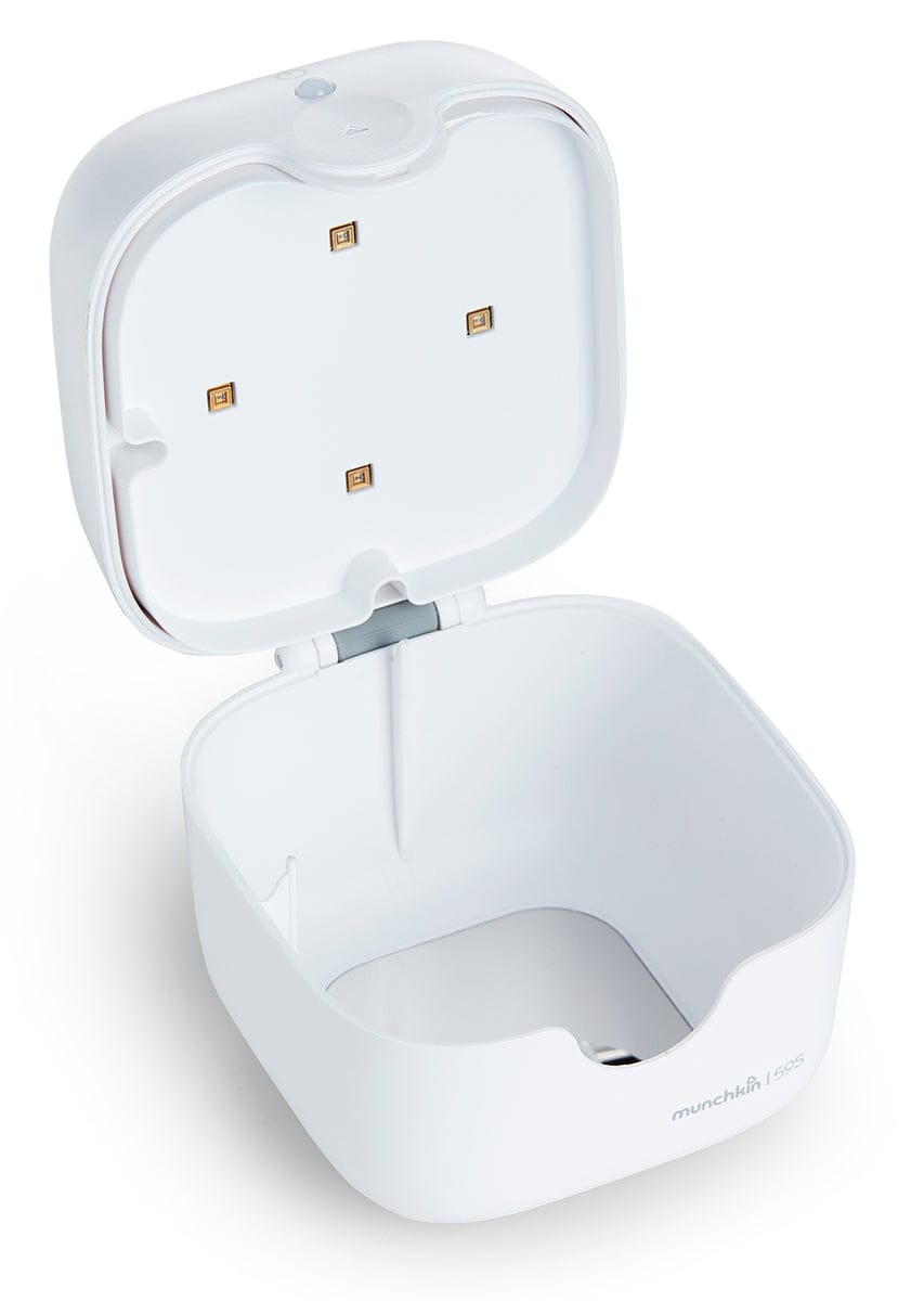 Babies drop things in dirty places at the worst times. The portable Mini Sterilizer sanitizes pacifiers, bottle nipples, and more in under a minute so you can be on your way anywhere. The Mini Sterilizer safely eliminates 99.9% of germs, bacteria, viruses* including (ATCC VR-740, Strain 229E) – a seasonal strain from the same family as -19 using just UV light and has been tested by independent labs. No chemicals, heat, or water needed! The Mini Sterilizer's 4 gold-plated UV LED lights are mercury and ozone free and auto shuts-off when the lid is opened. This small device is easy to throw into (or attach to) a purse or diaper bag, so when you need it, it's right at hand. Perfect for use in the home, but extra handy for public spaces such as daycare, playgrounds, doctor's offices, airports, and more! UV light is a safe and proven method of killing bacteria that is used by hospitals to sanitize everything from operating rooms to surgical equipment. Munchkin has partnered with 59S, the leader in UV LED technology, to develop convenient, UV-based sterilizing solutions that help families with young children lead healthier lives.
