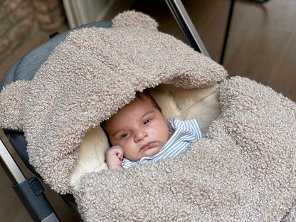The BébéPOD Teddy is the perfect sweatshirt-like infant bunting for milder temperatures featuring a soft plush lining and a fluffy teddy outer shell for maximum comfort. Adapt the BébéPOD to your car seat or stroller as you see fit. This snuggly teddy footmuff has a detachable cover that turns into a single-panel blanket on warmer days where the back is not a necessity. When it’s crisp outside and the family is ready for a stroll, the BébéPOD Teddy will cradle baby to sleep in no time.