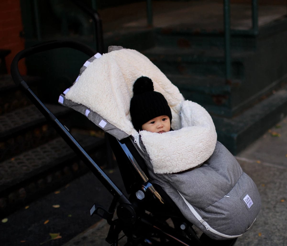 The LambPOD boasts an anti-slip, removable back panel?eliminating extra fabric between baby’s back and the safety harness?a convertible hood with an oversized collar, plus a double lined hood that slips over the top of the stroller to attach to the footmuff?effectively blocking out any cold air. The outer shell is water repellent, and the poly insulation and micro-fleece lining are extra soft. Bonus: the entire thing is machine washable and dryable.