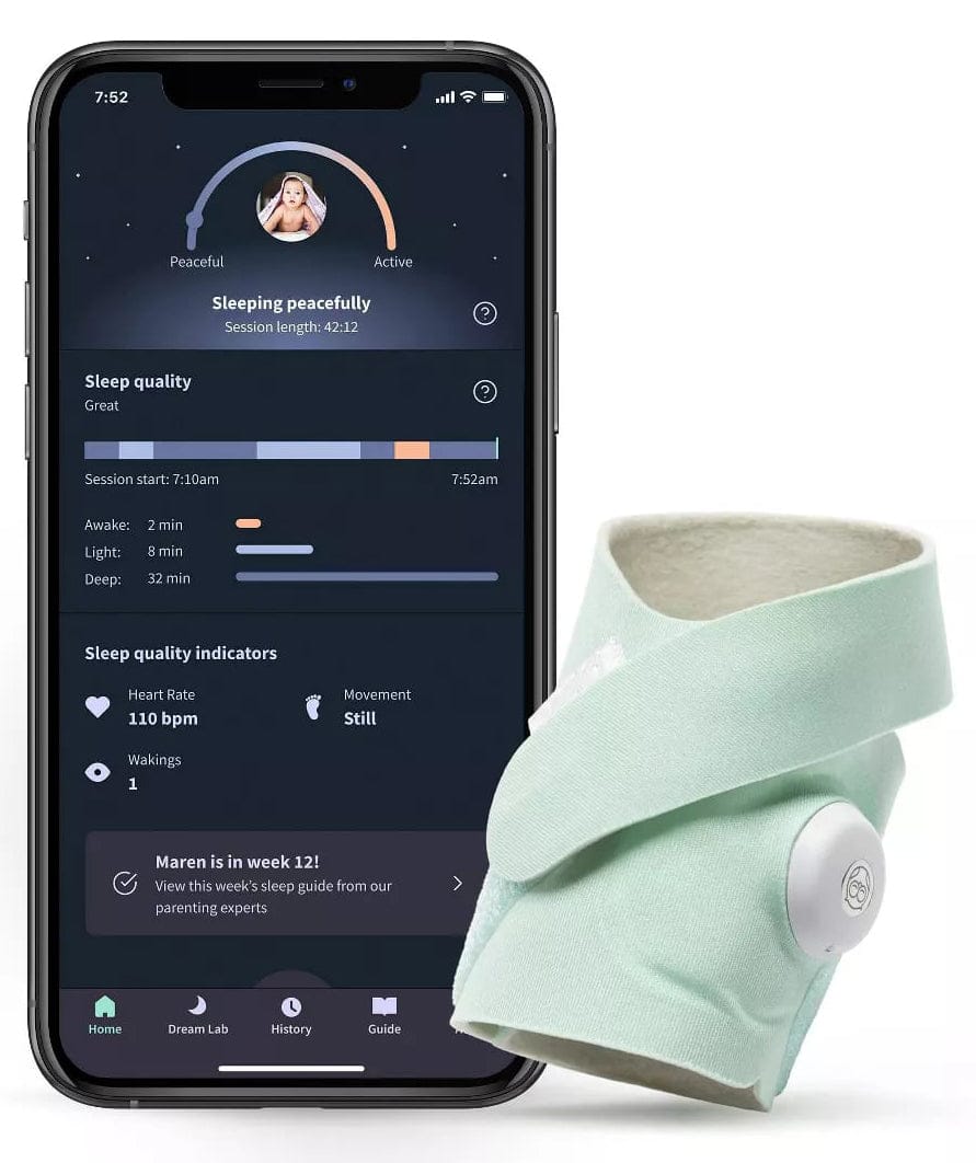 Dream Sock is intended to assist caregivers in tracking their child’s well-being by monitoring sleep patterns, quality and duration of sleep. When enabled (in-home use on healthy infants only), Dream Sock displays pulse rate (PR) and oxygen saturation (SpO2) values and provides a notification in the rare instance that the values move outside of a preset zone.