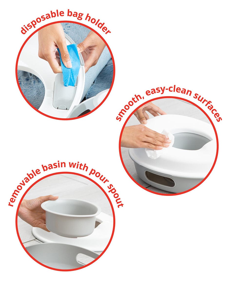 Always ready to go—anywhere and anytime—our 3-in-1 potty offers three smart solutions for bathroom breaks at home and on-the-go. Featuring a compact nesting design that’s great for travel, the sleek, easy-clean design works as an on-the-go potty with a handy disposable bag holder, a stand-alone potty with basin or a toilet trainer that fits most toilet seats for three options in one.