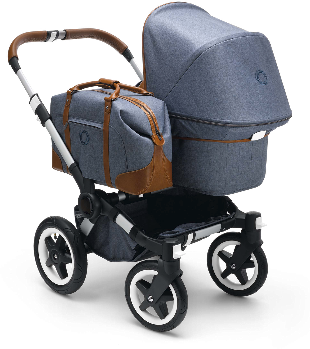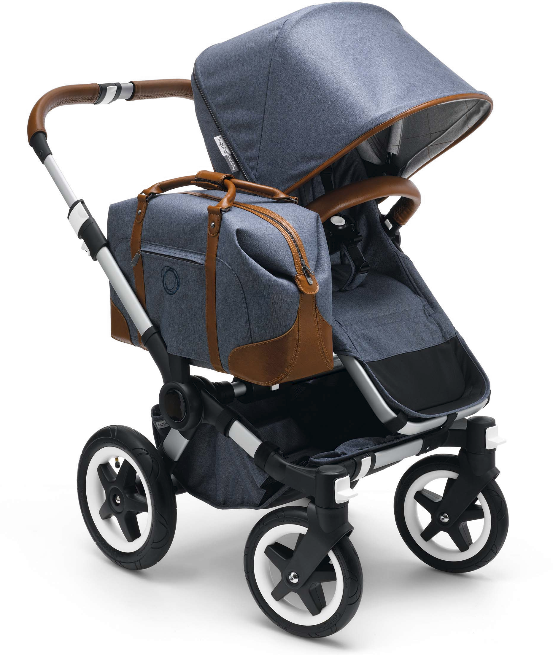 Comfortable, functional and elegant, the bugaboo donkey weekender comes with a blue-grey outer fabric, casual grey jersey lining, cognac hand-stitched faux leather handlebar and carry handle, and faux leather details on the sun canopy.