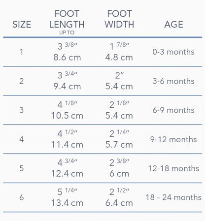 - Sizes 0-3 & 3-6 Months have a soft, suede sole.