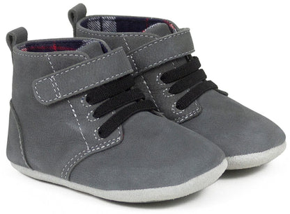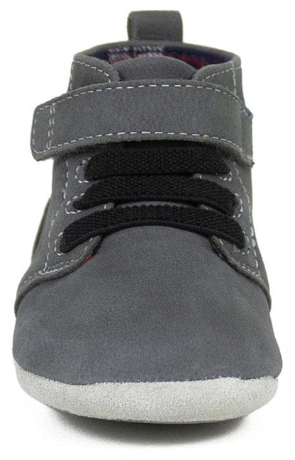 The Thiago First Kicks in Charcoal are introduced just in time for the colder months. Perfect for beginner walkers, the Thiago a classic grey suede baby shoe made with stretchy, faux laces, a velcro strap closure, and split rubber sole. In a nutshell, our Thiago is designed to stay on your baby's feet and assist in gripping the floor as walking becomes more the norm. The plaid lining adds a touch of warmth, too.