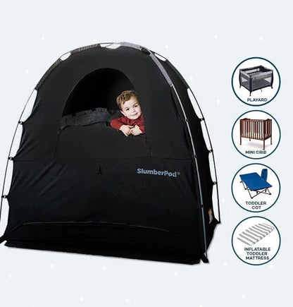 SlumberPod creates an ideal sleep environment when traveling or at home. SlumberPod is the first portable, privacy sleep nook that allows babies to sleep in their safe and familiar playard, mini crib or toddler air mattress with room to sit up or stand up inside. Created by a mother-daughter team, US-patented SlumberPod solves the age-old problem of getting a good night’s sleep while sharing a room with your little one or having a small child sleep in a room without blackout curtains. Thanks to SlumberPod’s dark yet breathable fabric, babies and toddlers can now sleep overnight or nap almost anywhere (approved for indoor use only).