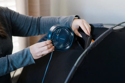 All SlumberPods include a fan pouch (fan sold separately or as a bundle with SlumberPod) and two "fly design" ventilation flaps located on the back of SlumberPod, as well as two ventilation flaps on the front to add airflow and light.