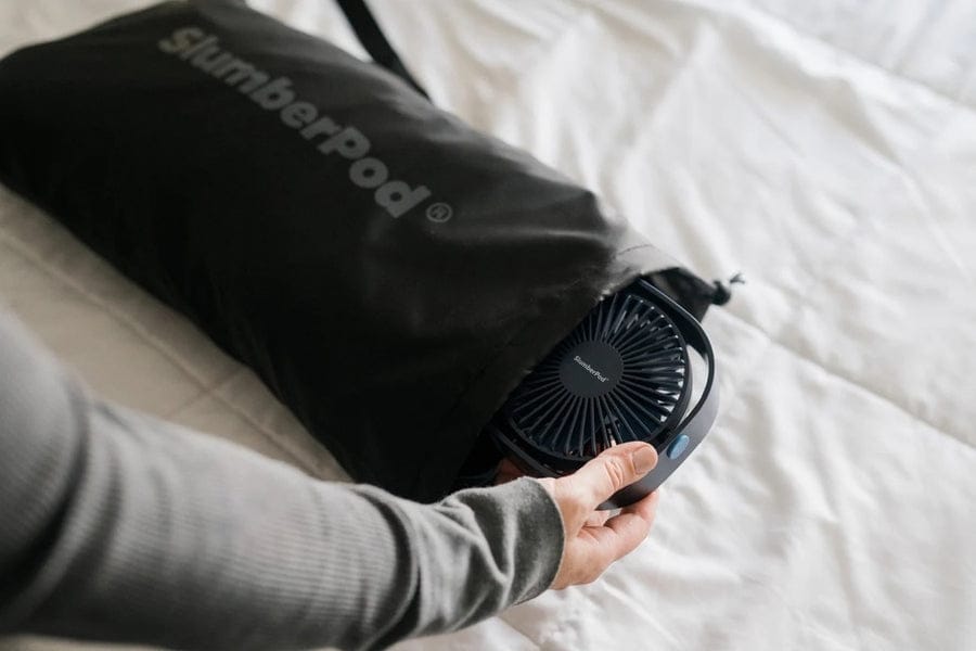 - All SlumberPods include a fan pouch (fan sold separately or as a bundle with SlumberPod) and two "fly design" ventilation flaps located on the back of SlumberPod, as well as two ventilation flaps on the front to add airflow and light.