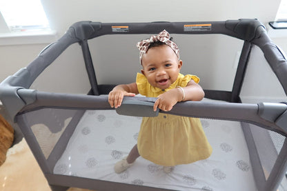 Rest assured that this portable playard provides a secure space for your baby to play,or enjoy peaceful nap times. With its streamlined and airy design, you'll have clear visibility of your little one from every angle. Suitable for babies from birth up to 30 pounds, this playard offers versatility as your baby grows. And when not in use, simply tuck it away in the included travel bag for effortless portability.