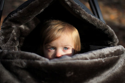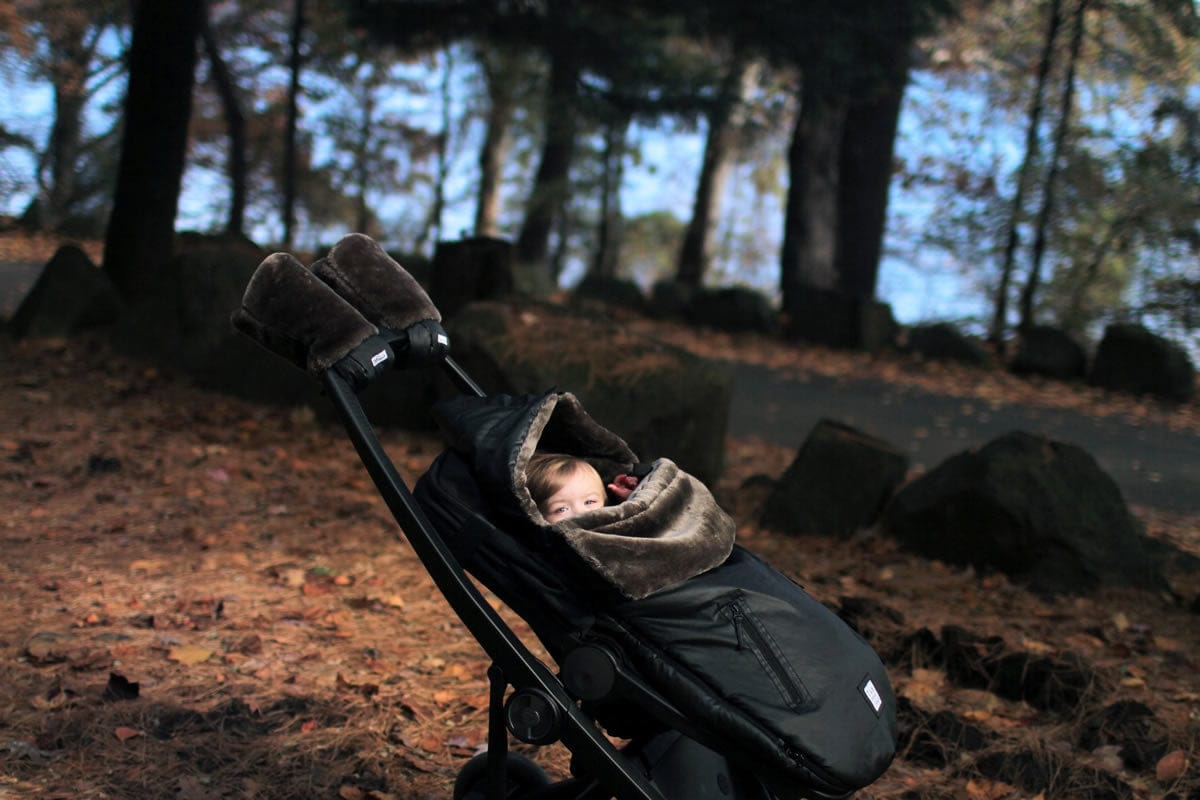 - Front flap can be pulled up and fastened to hood to protect child’s face from the elements