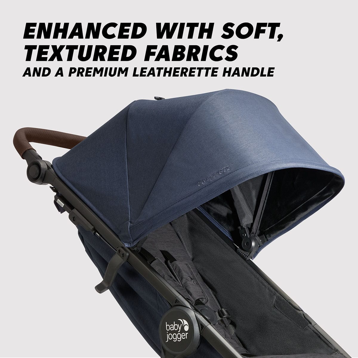 The Baby Jogger® City Mini® GT2 Stroller provides uncompromising agility on any terrain thanks to forever-air rubber tires that will never go flat and all-wheel suspension. It is enhanced by upgraded fabrics in rich colors that have a soft, textured feel you and baby will love.