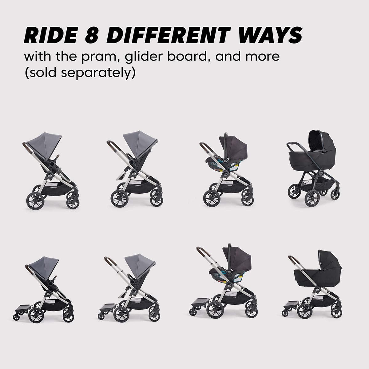 The infant car seat, pram, and glider board (sold separately) create 8 modes of use—perfect for going even bigger.