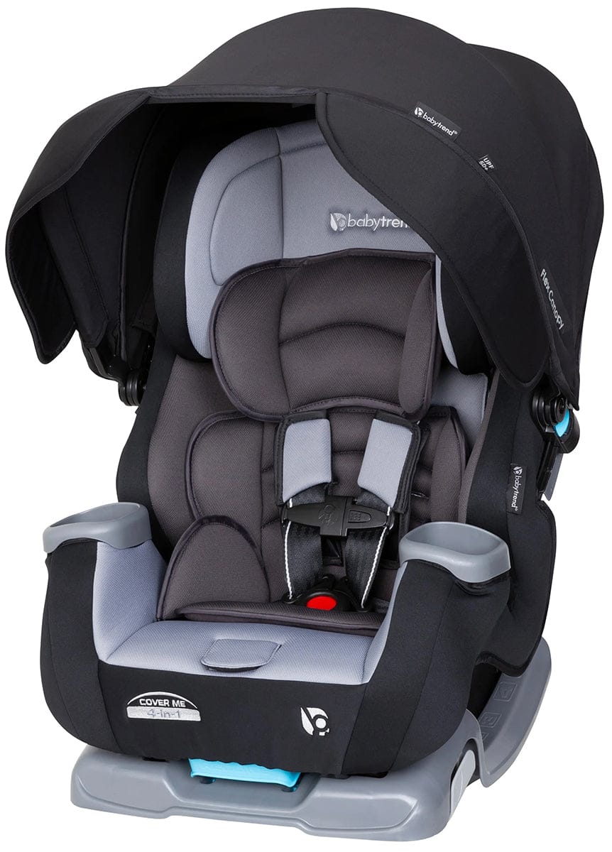 Introducing the Baby Trend CoverMe™ 4-in-1 Convertible Car Seat! In our study involving 400+ moms currently using convertible car seats, the #1 complaint about their convertible is children irritated by sunlight in the cars. The CoverMe™ has an integrated patented height and angle adjustable UPF 50+ canopy for full in-car shade protection. The canopy is integrated and attached on a built-in track so it's easy to adjust and remove. Flip-out side visors provide extra shade protection for kids when the car is in motion and the sunlight's coming from multiple directions.