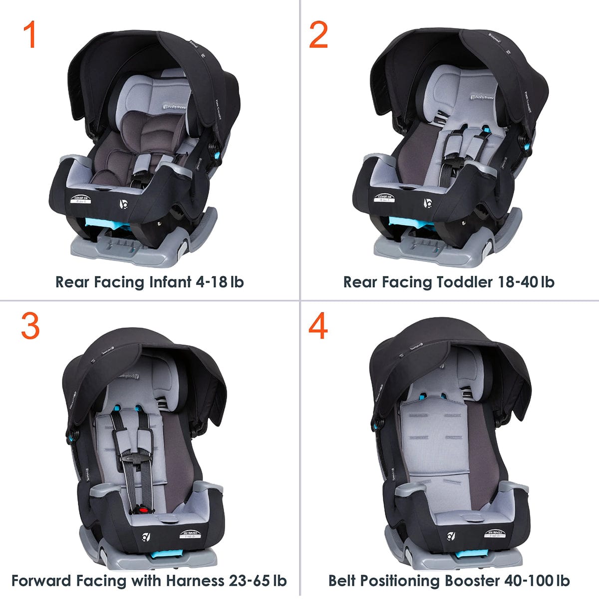 - 4-in-1 Seating System: Built for extended use including 1) Rear Facing Infant mode from 4 to 18 lb 2) Rear Facing Toddler mode from 18 to 40 lb 3) Forward Facing with Harness mode from 22 to 65 lb 4) Belt Positioning Booster mode from 40 to 100 lb