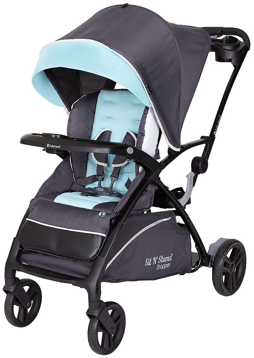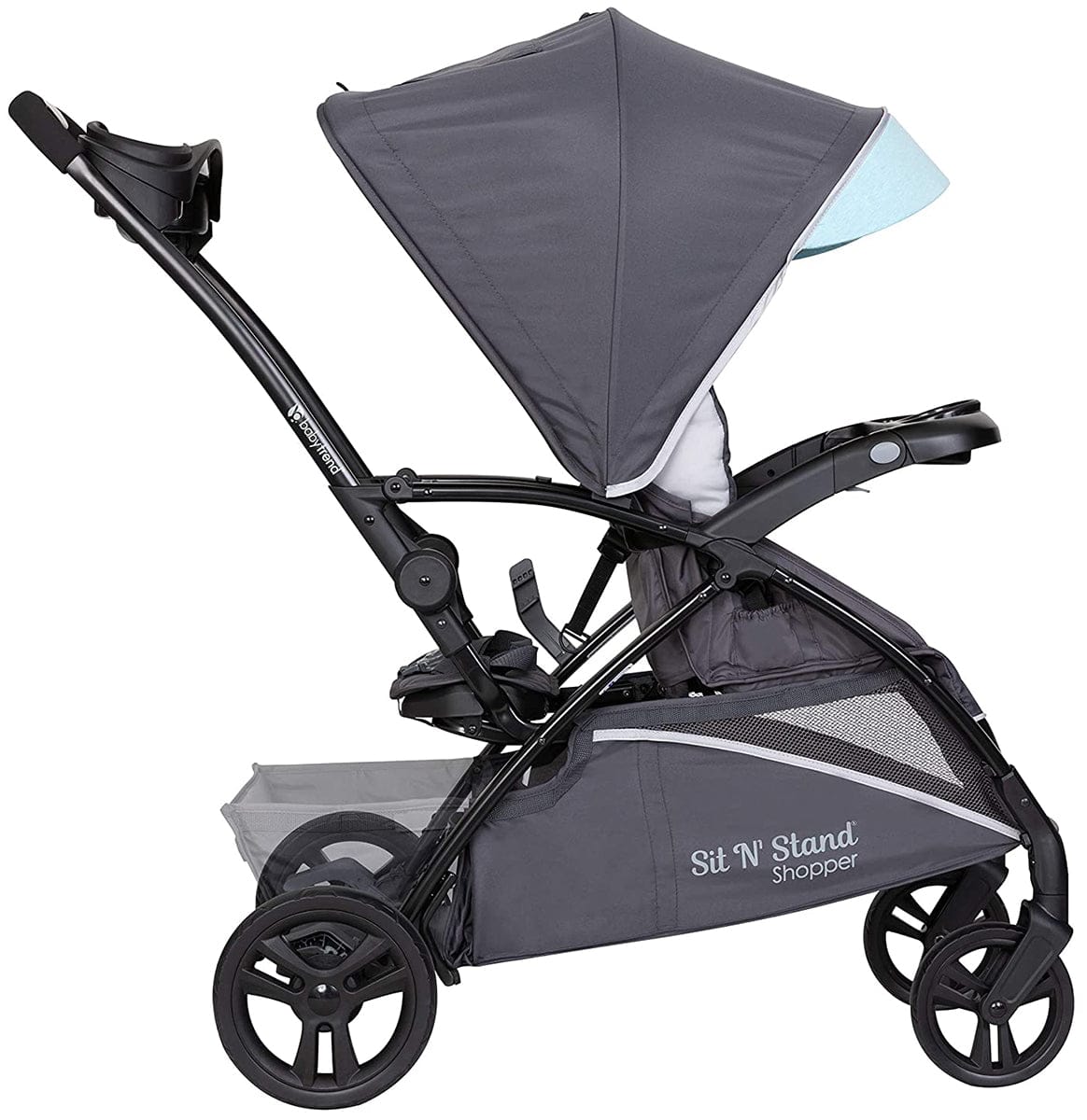 The Baby Trend® Sit N’ Stand® 5-in-1 Shopper Stroller is perfect for your growing family. With the new compact and streamlined frame, our Sit N’ Stand® 5-in-1 Shopper Stroller has 5 modes of use – travel system mode, car seat in the front seat and older child standing on platform, child in the stroller seat only, child in the stroller seat with sibling sitting on bench, and child in the stroller seat with sibling standing. The front and back seats can hold kids up to 50lbs each.