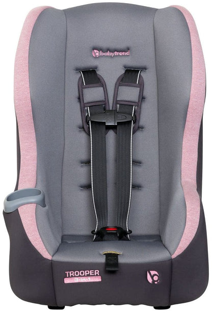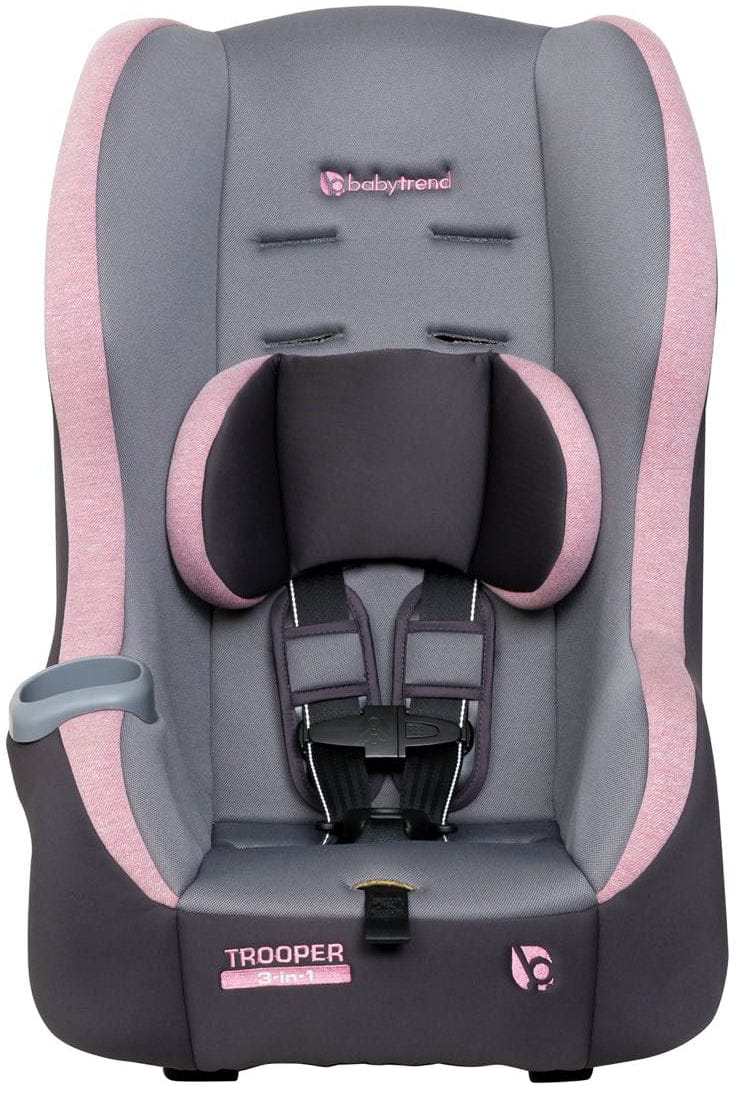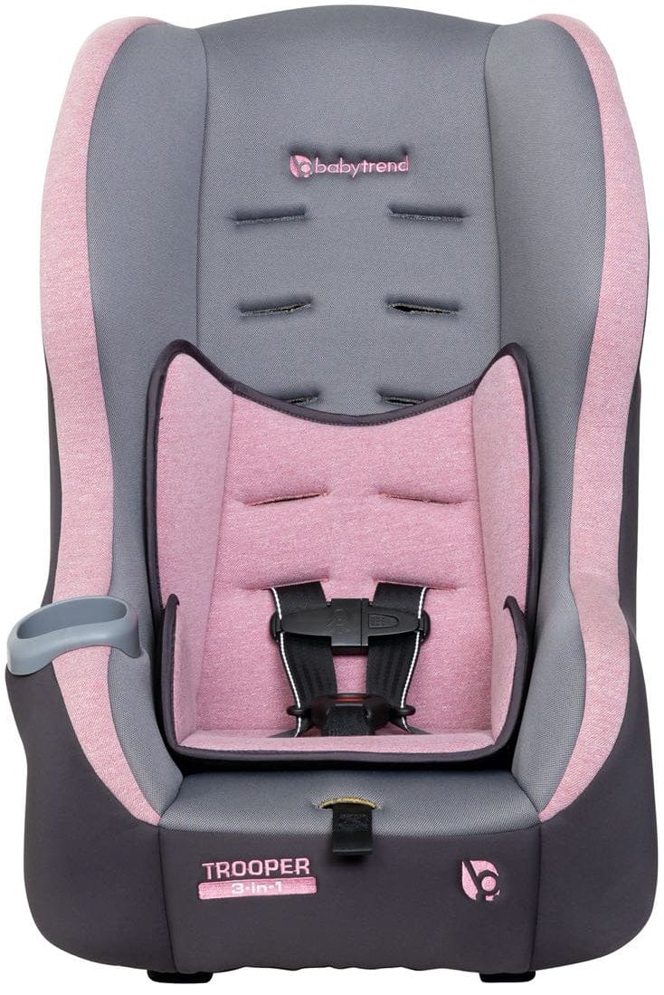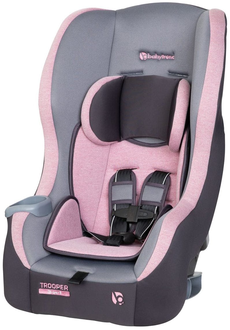 The Baby Trend Trooper 3-in-1 Convertible Car Seat converts from rear-facing infant seat (4-18lbs) and rear-facing toddler seat (18-40lbs) to forward-facing toddler seat (22-65lbs) as your child grows. With 5-position shoulder height adjustment and 3- position crotch buckle for seat adjustment, the Trooper convertible gives parents the ultra-convenience for installation and adjustment. The rear-facing recline flip foot also allows the Trooper to get great installation angles with ease. Trooper’s nimble frame can fit three across in most vehicles which is great for families that have more than one kiddo. The lightweight shell also allows for use of LATCH installation up to 55 lbs. The super-deep side wings offer better side impact protection and premium cushion, giving your babies great head protection and support. With premium fabric and the convenient integrated cup holder on the side, our Baby Trend Trooper 3-in-1 Convertible Car Seat truly gives your children the most comfortable and convenient commute/travel experience.