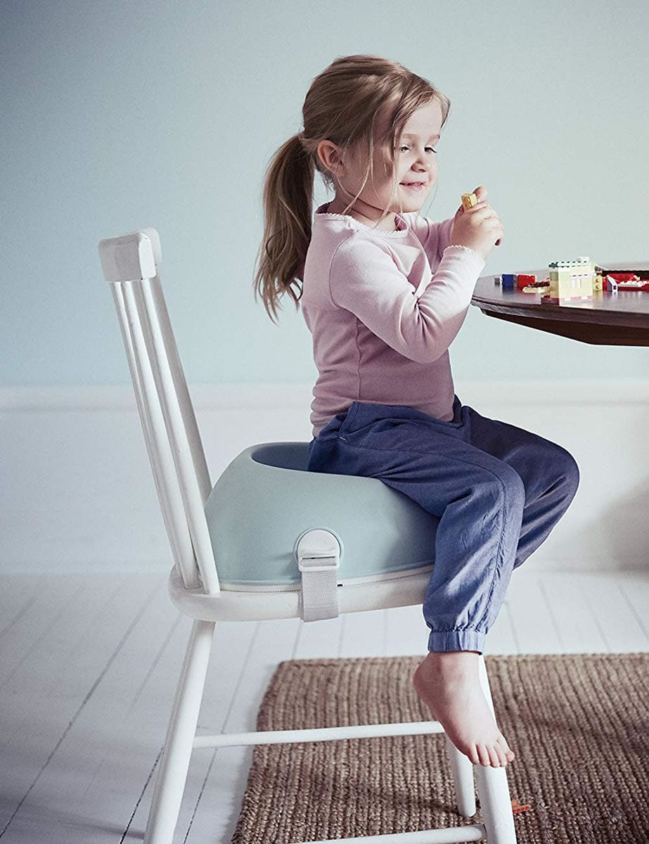 - Comfortable height: Your child can reach the table without needing to sit on your lap. The booster seat also has a textured, anti-slip surface that prevents your child from sliding around when on the seat.