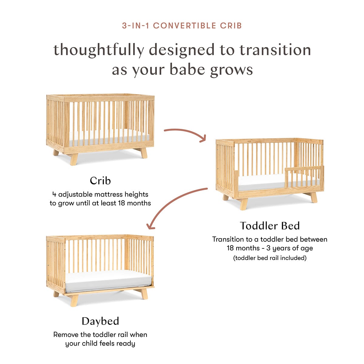 - 3-IN-1 CONVERTIBILITY: Easily transitions as your babe grows from crib to toddler bed and daybed, with an included toddler bed conversion kit for your convenience. Suitable from newborn up to 4 years old.