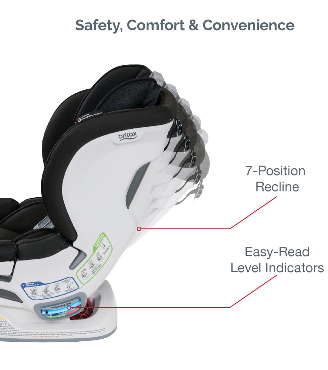 - Easy-Read Level Indicators help you find the correct recline angle for your vehicle