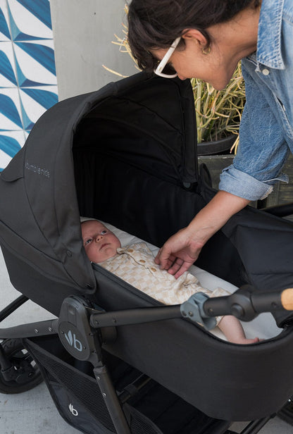 Simply click on the Bumbleride Bassinet to make your single stroller a comfortable, parent-facing pram. The Bumbleride Bassinet provides an infant bed using OEKO-TEX certified 100% recycled polyester fabric, a sturdy, lightweight aluminum base and breathable mattress covered in 100% GOTS Certified Organic Cotton. The bassinet has a redesigned canopy and an added wind guard for extra protection from the elements and mesh peek-a-boo window for venting and airflow.