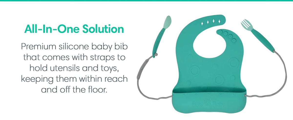 Introducing the all-in-one solution for mealtime and playtime with your baby - The first-ever premium silicone baby bib that comes with straps to hold utensils and toys!