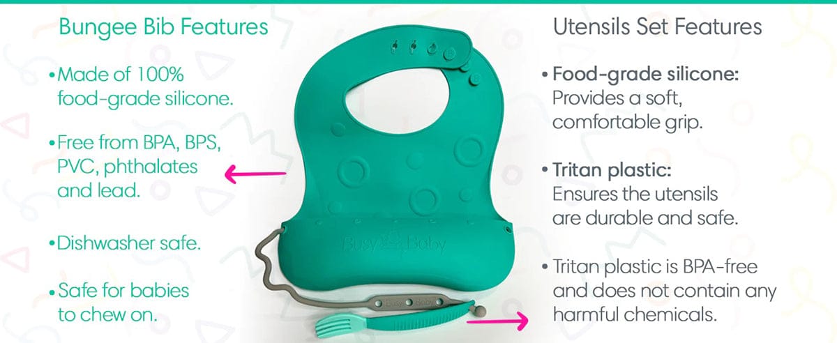 Introducing the all-in-one solution for mealtime and playtime with your baby - The first-ever premium silicone baby bib that comes with straps to hold utensils and toys! This set comes with the Busy Baby Feeding Utensils which include a fork, spoon, and knife.