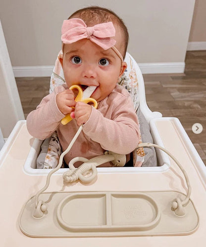 This children's placemat comes with two light grey toy straps to keep toys within your child's reach and free from germs! Travel Wet Bag included. Made with food-grade silicone, this placemat contains no Phthalates, BPA, BPS, or PVC.