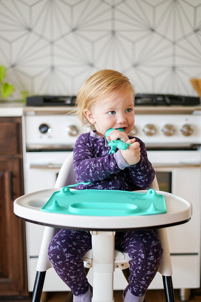 The easy attach Busy Baby Toy Bungee (sold separately) safely and easily connects into the end of the spoon allowing it to be connected to the Busy Baby Placemat itself. This silicone ball-and-socket engineering helps to always keep this teether and training spoon within an arms reach of your growing child.