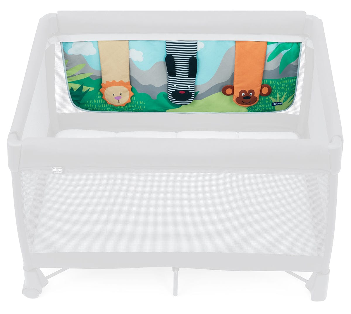 With a fun safari animal motif, the Dash™ Play Panel zips onto the Chicco Dash™ Instant Setup Playard (sold separately) to encourage creativity and developmental play. Babies are entertained by the vivid colors and friendly faces of the cute fabric creatures. Toddlers can interact with the three crinkle safari animal friends right at their eye level for imaginative play and tactile exploration. No need to remove the panel when closing the playard, so the fun goes with your little one wherever you go. If the fabric becomes soiled, just zip off the machine-washable panel for easy cleaning.