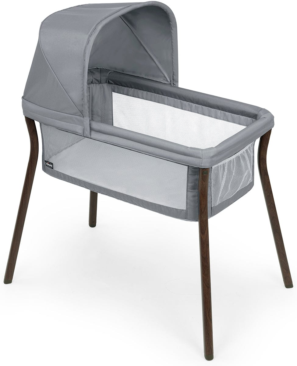 Sturdy metal legs snap on in seconds and a convenient storage pocket keeps little essentials close at hand. The waterproof mattress includes a bonus fitted sheet and the bassinet fabrics zip-off for easy machine washing.