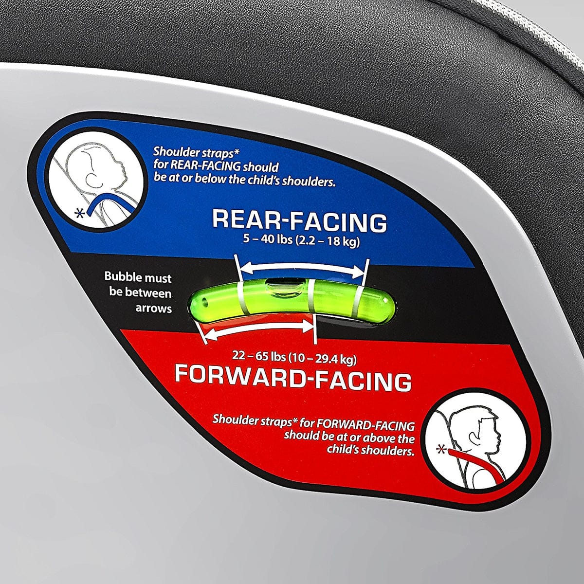 • Dual RideRight bubble level-indicators verify seat angle in both rear-facing and forward-facing modes
