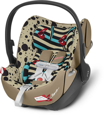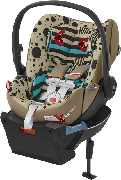 FLAT RECLINEReclines to a lie-flat position, transforming into a carrycot so baby can rest in an ergonomically correct position LINEAR SIDE IMPACT PROTECTIONTelescopic Linear Side Protection transfers impact forces to the seat's shell, where it is absorbed away from baby. HEIGHT ADJUSTABLE11-position height-adjustable headrest ensures safest and most comfortable fit. FOLD-AWAY CANOPYFold-away UVP50+ sun canopy protects baby from sun, wind and rain. RECLINE LINEAR SIDE IMPACT PROTECTION Love has been a guiding principle of Karolina Kurkova?s twenty years in the fashion world?an attitude of passion and playfulness that shaped her as both a supermodel and a modern parent. So it was only natural that love was the inspiration for her designs for the Cybex X Karolina Kurkova Collection. These designs crackle with the wild and contradictory essence of love: a scintillating palette of vivid colors; cosmic shapes juxtaposed with bold lines; and an iconic pair of cherry-red lips. The CYBEX by Karolina Kurkova Collection lets you show your love with an unforgettable display of fun and bright energy. The Cloud Q is the latest result of CYBEX ongoing safety research, building on the successful tradition of previous award winning infant car seats. While improving on already reliable and unique safety features, the Cloud Q introduces a new unique feature allowing it to be reclined when used outside of the car, creating a perfect symbiosis of superb safety in the car and a new level of comfort as a travel system. The reclining backrest is easy to use by simply squeezing a lever and pushing down, which simultaneously reclines the backrest and extends the foot rest to create an ergonomically correct position for the baby, all while having the baby in the carrier. The European style Load Leg prevents the seat from rotating forward and keeps the seat at the same angle during a crash, allowing the back of the seat to perfectly support and protect the baby?s head, neck and back. The Load Leg also channels a large amount of crash energy into the vehicle floor, helping decrease forces on the baby by up to 50%. The unique European belt routing with the shoulder belt behind carrier makes this installation as safe as using the base with the Load Leg. Makes travel in Taxis and on vacation safe and simple! The unique telescopic Linear Side-impact Protection (LSP) system starts absorbing side-impact forces as early as possible by channeling them through the flexible and energy absorbing shell. This greatly reduces the forces on the baby. The unique telescopic Linear Side-impact Protection (LSP) system starts absorbing side-impact forces as early as possible by channeling them through the flexible and energy absorbing shell. This greatly reduces the forces on the baby. The 11 position height adjustable headrest, also automatically adjust the harness position for a perfect fit without any need for re-threading the harness. The fully integrated, extra large sun canopy with UV50+ protection, elegantly disappear behind the color coordinated visor when not in use. Extends incrementally for perfect protection against sun, wind or rain. Key Features "Plus" fabric for a denim-like look. Reclining backrest: Ergonomic full recline position when used outside the car 11-position height adjustable headrest: Automatically positions the no rethread harness for maximum safety Energy-absorbing shell: The flexible material and structure of the shell absorbs the forces of an impact and distributes them away from baby Adjustable Load Leg: Prevents seat from rotating forward in a crash, protecting baby?s spine Secure European Belt Routing: As safe without the base as with the base Telescopic L.S.P system: The telescopic Linear Side-impact Protection absorbs the force of a side-impact collision in combination with the energy absorbing shell Integrated and color coordinated extra-large canopy: Perfect sun and wind protection with UVP50+ Specifications Weight capacity: 4 to 35 lbs Height capacity: Up to 30" Weight- Carrier: 12.6 lbs. Weight- Base: 12 lbs. Dimensions: L 26? - W 17 ?? - H 15 ??